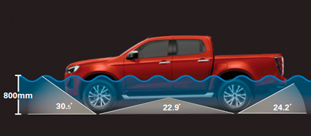 D-Max ir uzticams ceļabiedrs, braucot pa smiltīm, dubļiem un upju gultnēm ar dziļumu līdz 800 mm – bez papildpiederumiem. Ar pārslēdzamu pilnpiedziņu un diferenciāļa bloķētāju* jūs varat pārvarēt jebkuru reljefu un droši sasniegt galamērķi pat tad, ja krava ir smagāka par 1000 kg.